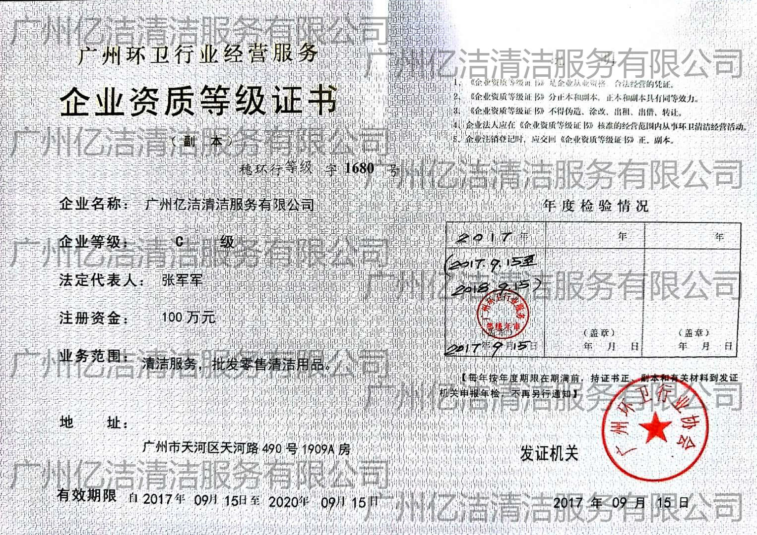 廣州億潔清潔服務(wù)有限公司是經(jīng)廣州市工商行政管理局批準(zhǔn)成立的(注冊資本:100萬元人民幣)。具有獨(dú)立法人資質(zhì)。公司成立2015年,公司具備完善的管理體系和高素質(zhì)管理隊(duì)伍,擁有特種技術(shù)人員33名,保潔服務(wù)人員上萬名,覆蓋廣州市,能及時(shí)調(diào)配并快速投入高效運(yùn)行。我們的每個(gè)員工都經(jīng)過公司的嚴(yán)格篩選,嚴(yán)格培訓(xùn),定期培訓(xùn)后持證上崗以保證服務(wù)品質(zhì),保障客戶的權(quán)利,利益,形象等不受損失。 廣州億潔清潔公司是一家設(shè)備齊全,技術(shù)強(qiáng)大的綜合型清潔服務(wù)公司,為客戶提供完善服務(wù)尊定了堅(jiān)定的基礎(chǔ)。 司于2010年全面推行了ISO9001質(zhì)量管理體系認(rèn)證和ISO14001國際環(huán)保體系認(rèn)證。先后獲得廣州高層建筑外墻清洗維修作業(yè)【安全資質(zhì)證書】、【廣州環(huán)衛(wèi)企業(yè)等級證書C級資質(zhì)】、廣州疾控中心頒發(fā)的【四害消殺服務(wù)資質(zhì)證】、【空氣治理A級資質(zhì)】、中國石材協(xié)會頒發(fā)的【石材資質(zhì)B級資質(zhì)】等。 廣州億潔清潔服務(wù)有限公司致力于打造專業(yè)、實(shí)惠、靠譜的保潔服務(wù)公司,把專業(yè)的事情交給專業(yè)的我們,您放心! 億潔清潔服務(wù)項(xiàng)目: 廣州保潔服務(wù):新建樓宇、別墅、酒店、醫(yī)院、辦公樓、賓館、企事業(yè)單位廠房竣工后開荒及裝修后精細(xì)保潔.工程保潔服務(wù)。 廣州物業(yè)托管:為廣州市各大企事業(yè)單位、賓館、政府機(jī)關(guān)、小區(qū)物業(yè)、酒店及廠房提供專業(yè)化保潔、園林、設(shè)施維護(hù)等管理服務(wù)。 廣州高空作業(yè):高空玻璃幕...[詳情]